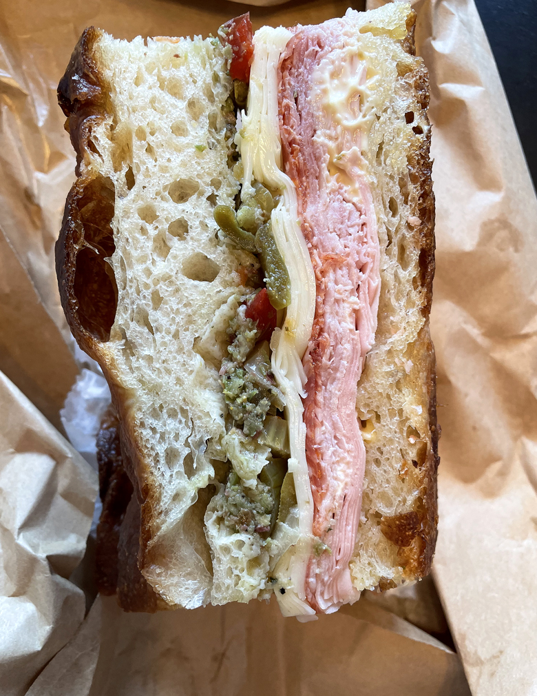 The Y’At is similar, but meatier, with mortadella, sopressata, rosemary ham, and provolone. The mayo and tapenade on it are both made in-house, too. Rich and hearty tasting, it has the lovely taste of rosemary shining through.
