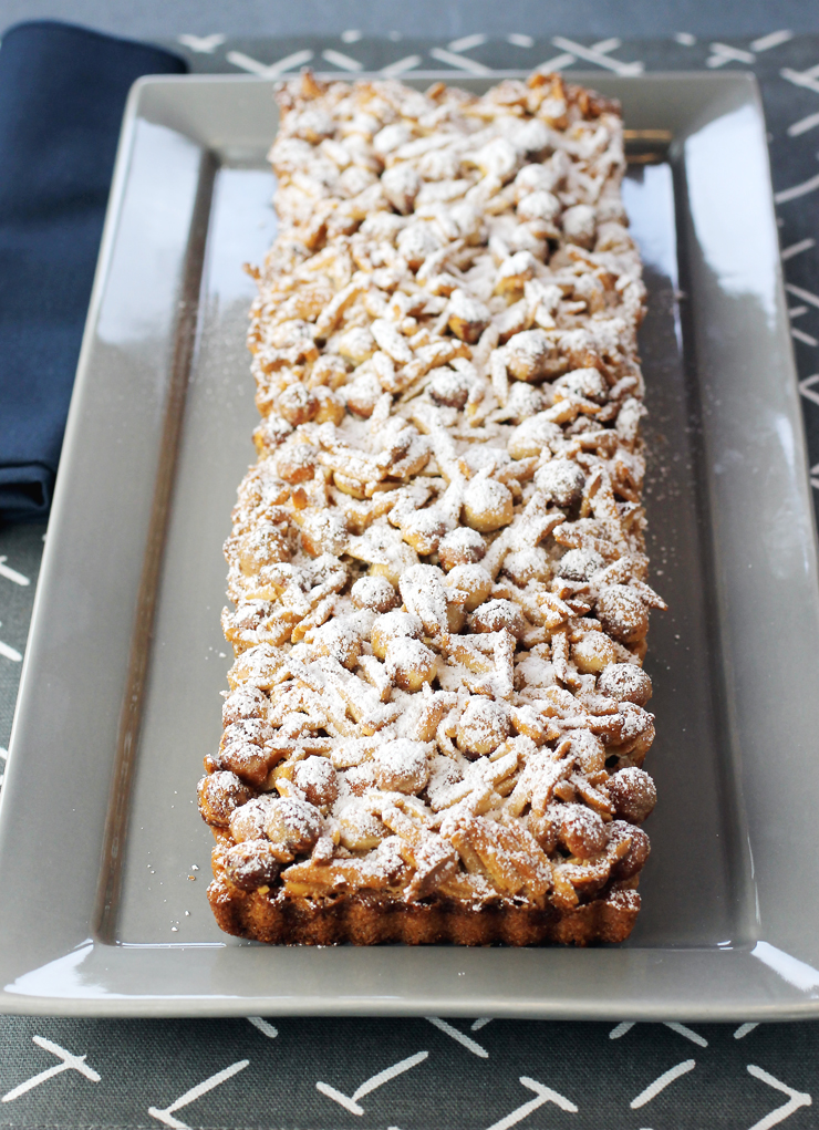 The frosting is made with butter browned in a pan on the stovetop, then refrigerated until hardened. Unmold the butter, add cut up pieces to your mixer bowl with a whopping 12 ounces of cream cheese and powdered sugar, and beat until smooth. Transfer contents to a piping bag to pipe the frosting all over the cake. For the final touch, sprinkle on more chopped walnuts moistened with a little more olive oil and seasoned with a little salt.