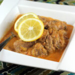 First, sear them in a non-stick pan with olive oil. Remove them from the pan, then saute chopped onions before adding in water, crushed tomatoes and the aromatics of cinnamon sticks, bay leaves, paprika, cumin, nutmeg, cloves, and a touch of sugar to form the braising liquid. Add back the chicken, cover the pan, and allow to cook, turning the chicken every so often, until done.