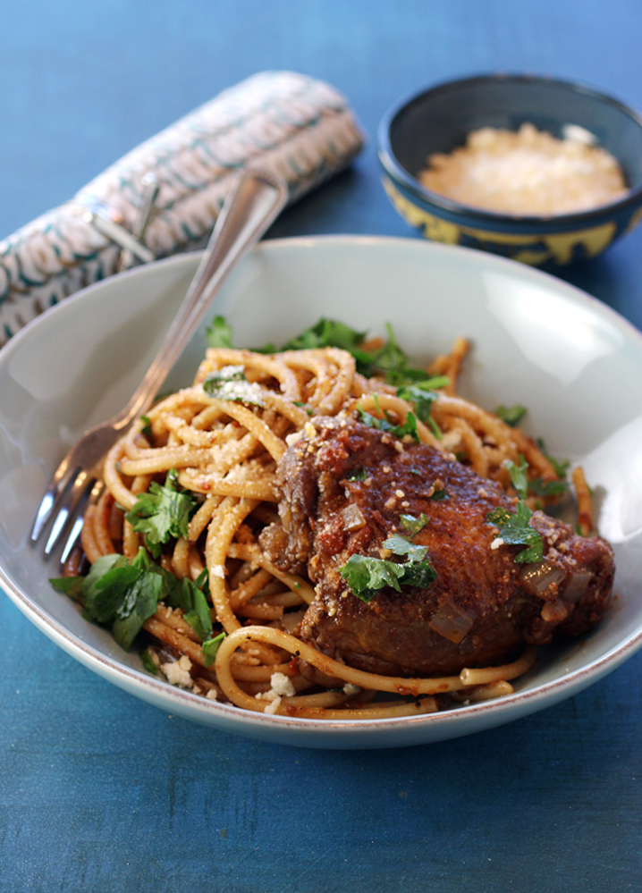 Boil bucatini, drain, then toss with the sauce from the chicken. The recipe stated to toss the pasta with a little olive oil before adding the sauce. But since I’ve always heard this is a no-no among Italians because it prevents the sauce from clinging to the noodles, I decided to toss the pasta with the sauce first, then drizzle the olive oil on the noodles. I made that change below, too.