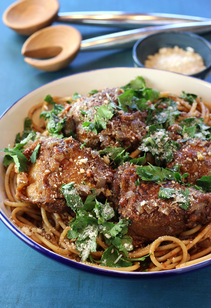 Remove the chicken pieces from the tomato sauce, then add the tomato sauce to the pasta and toss to combine. Add the remaining 2 tablespoons olive oil and stir. Place the chicken on top, sprinkle with the parsley and Parmesan, and serve immediately.