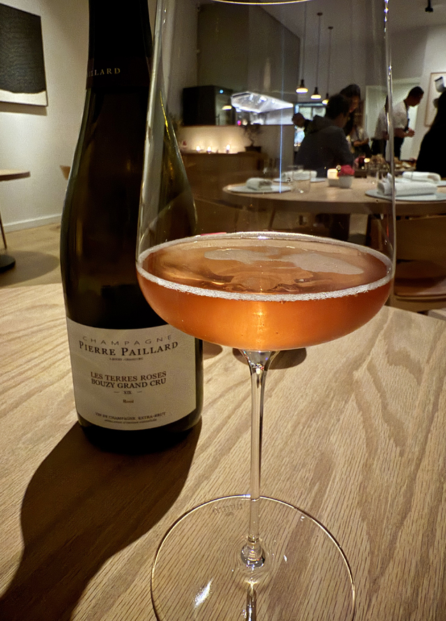 While beer and wines are available by the glass or bottle, the staff recommends ordering at least one glass of Champagne, because bubbles and caviar are natural partners, and bubbles with fried chicken are definitely inspired ones. I enjoyed a Pierre Paillard Champagne Grand Cru Rosé Extra Brut Les Terres Roses, which was a deep rosy pink in color, and powerful on the palate with vivid notes of strawberry and raspberry.