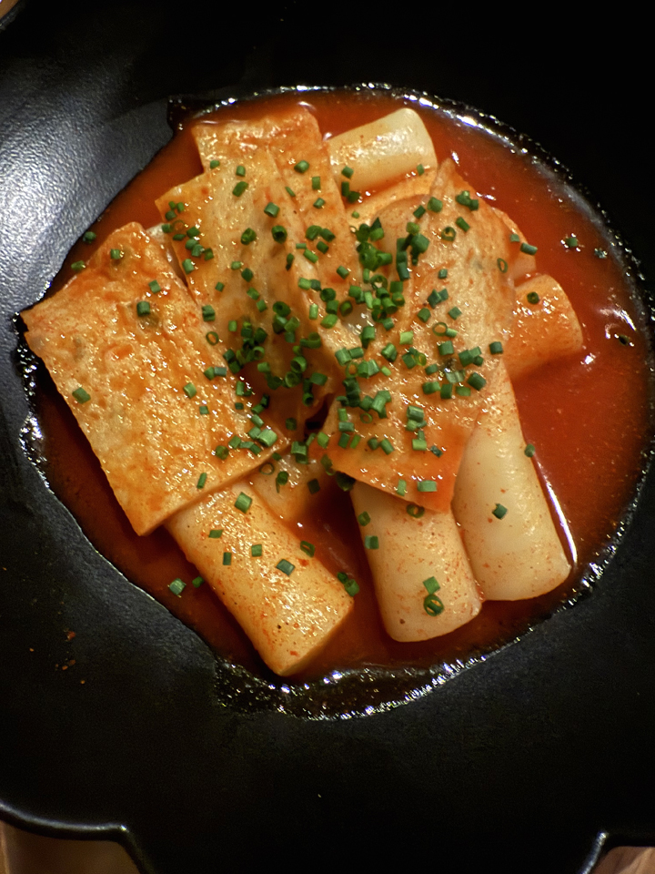 The cylindrical tteokbokki are crowned with thin slices of fish cake, all afloat in a deep red sauce that may shout five-alarm fire, but don’t panic. They do pack a pretty spicy punch, as this traditional drinking food should, but it’s not incendiary. Your forehead may start to warm. Even so, you’ll find yourself reaching again and again for these delightfully chewy and bouncy rice cakes.