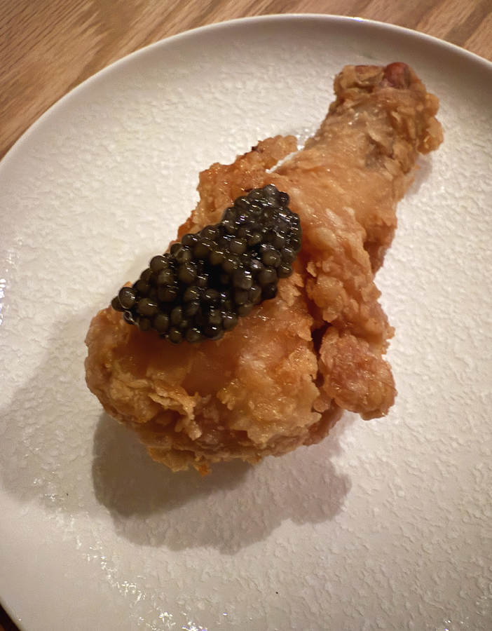 But there are other times when fried chicken is savored in a chic minimalist dining room with mood lighting, a glass of French Champagne, and a tin of osetra caviar with a mother-of-pearl spoon to complete the picture.