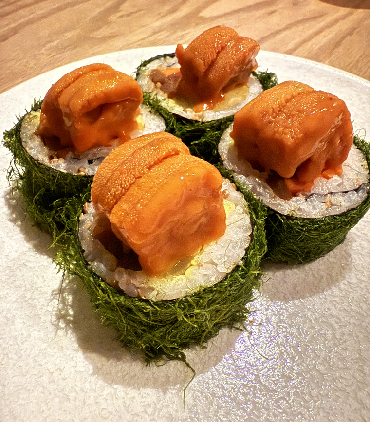 The gimbap is a maki-like rice roll wrapped in a unique seaweed from South Korea, gamtae, that resembles fine grass clippings in an Easter basket. Its taste is like nori crossed with grass. There are crunchy carrots inside and a big lobe of uni artfully arranged overtop.