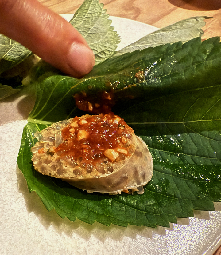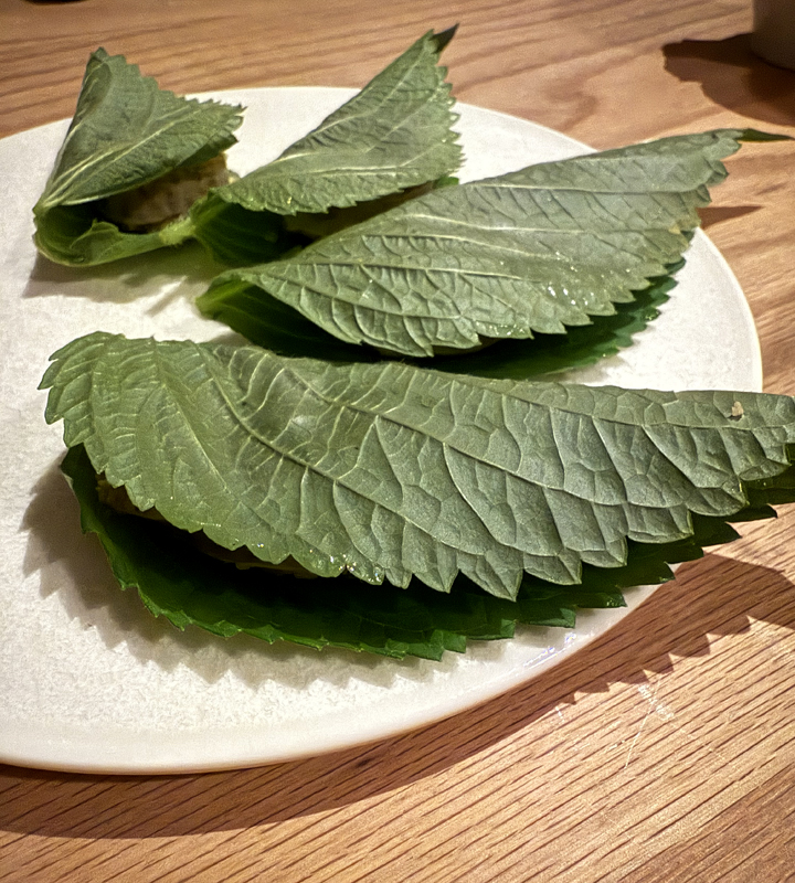 Large green shiso leaves hold a slice of soondae pork sausage that’s usually made with pork blood. That’s omitted here, with the pork instead mixed with glass noodles. It’s a spicy bite that gets a fresh, minty-basil whoosh from the perilla.
