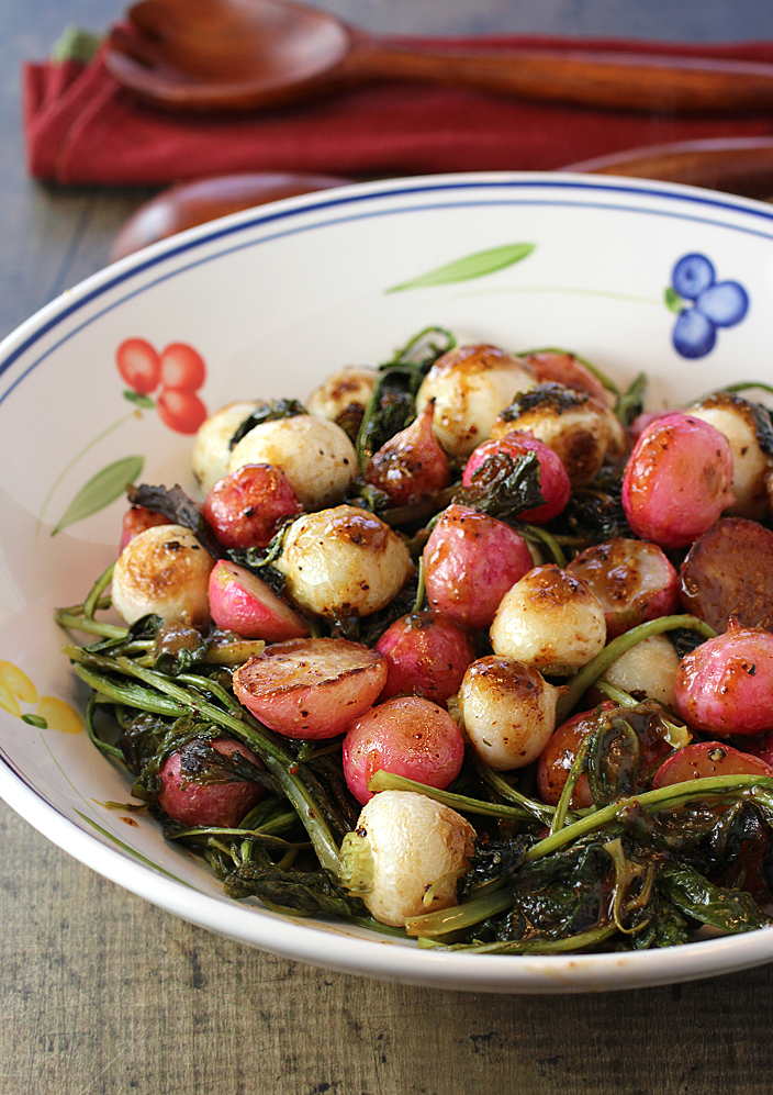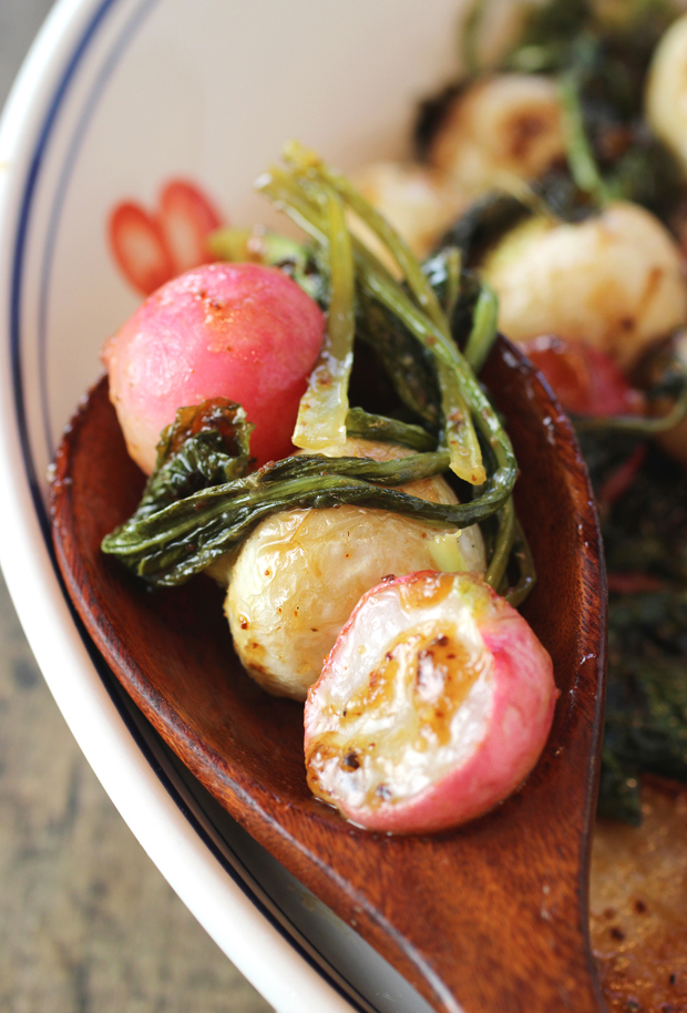 Roasted turnips and radishes, plus their green tops, in a delectable sauce.