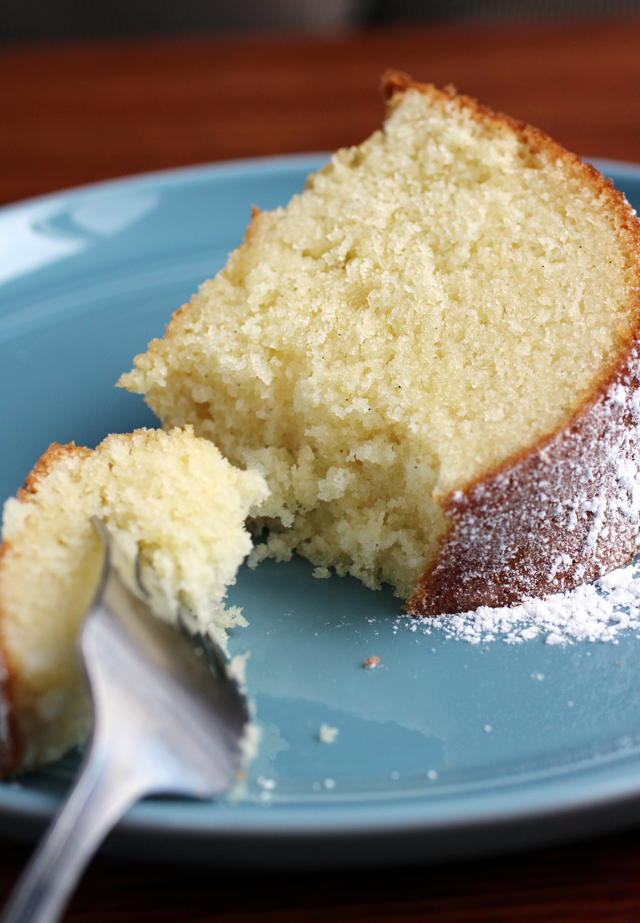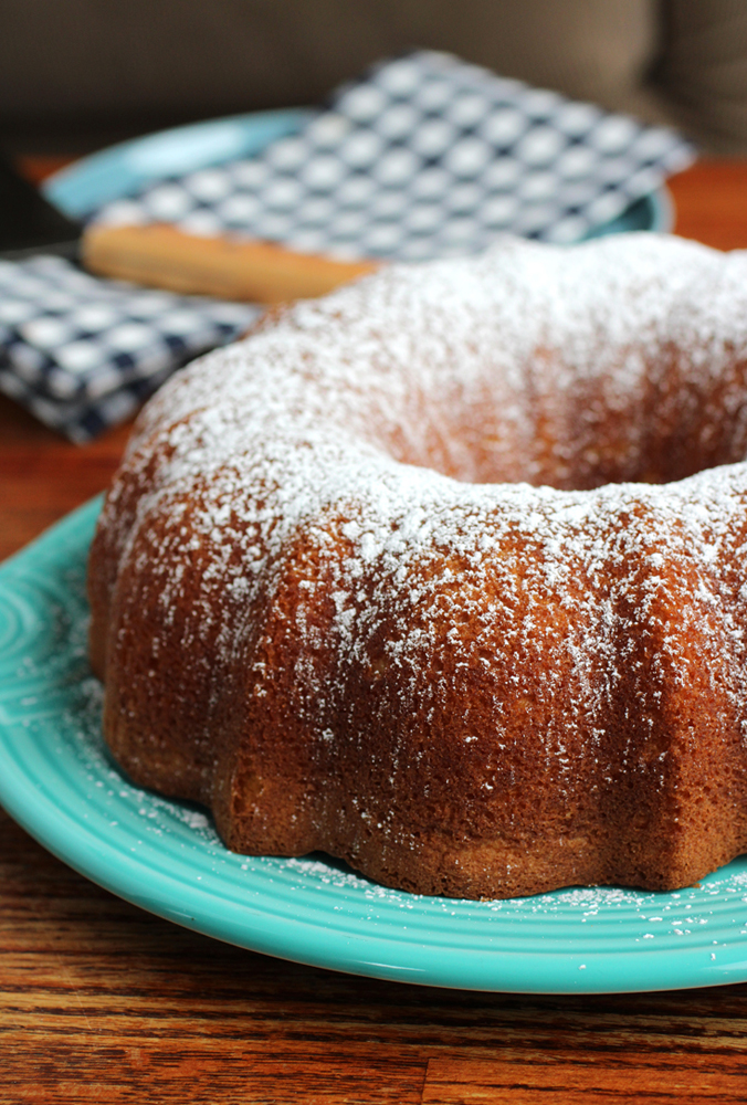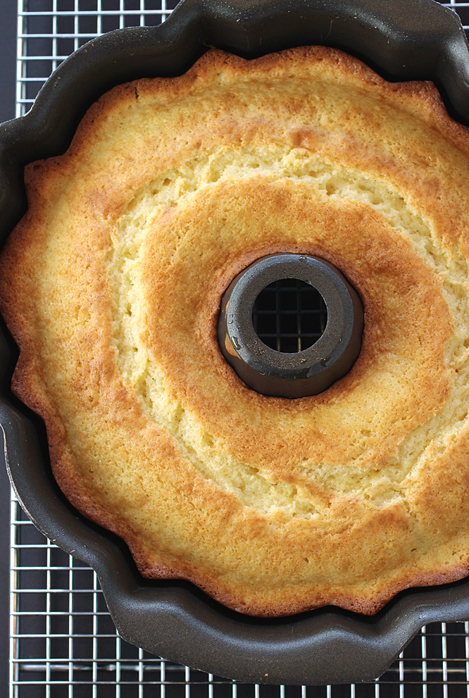 Transfer the batter to a greased and floured Bundt pan, then bake. Allow to cool in the pan for 10 minutes before inverting onto a rack to cool completely. Dust with powdered sugar, if you like. That’s really all that it needs.
