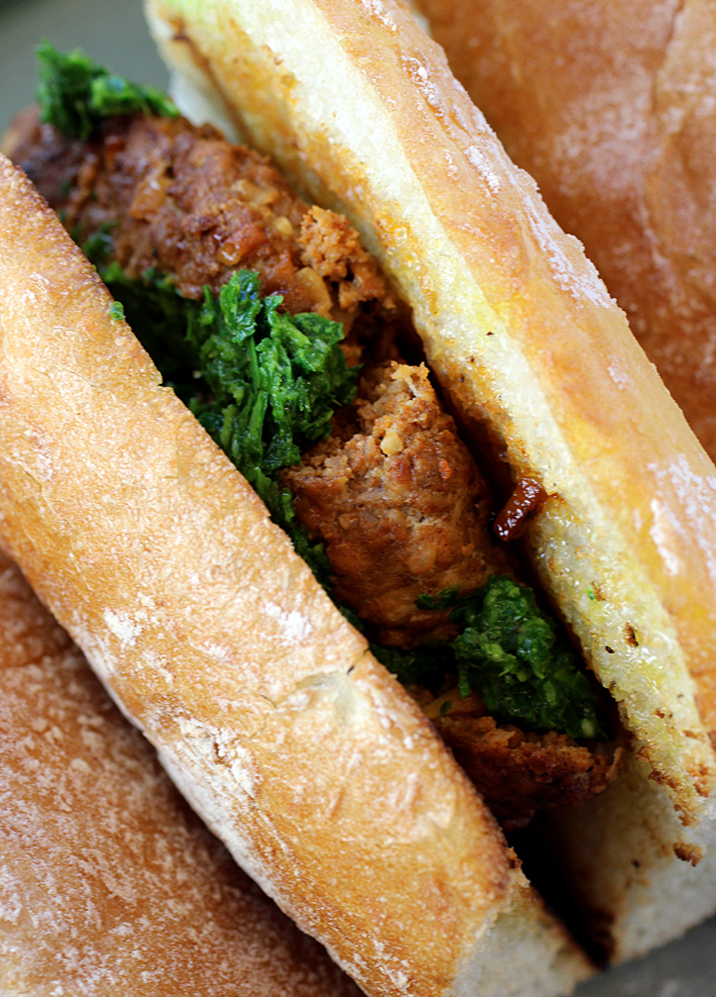 A torpedo-type roll works well here. I used francese rolls, which are slightly larger on the ends. That meant that I didn’t always hit on a piece of pork in every early bite. But I didn’t mind, and if you don’t, either, those types of rolls are fine in a pinch.