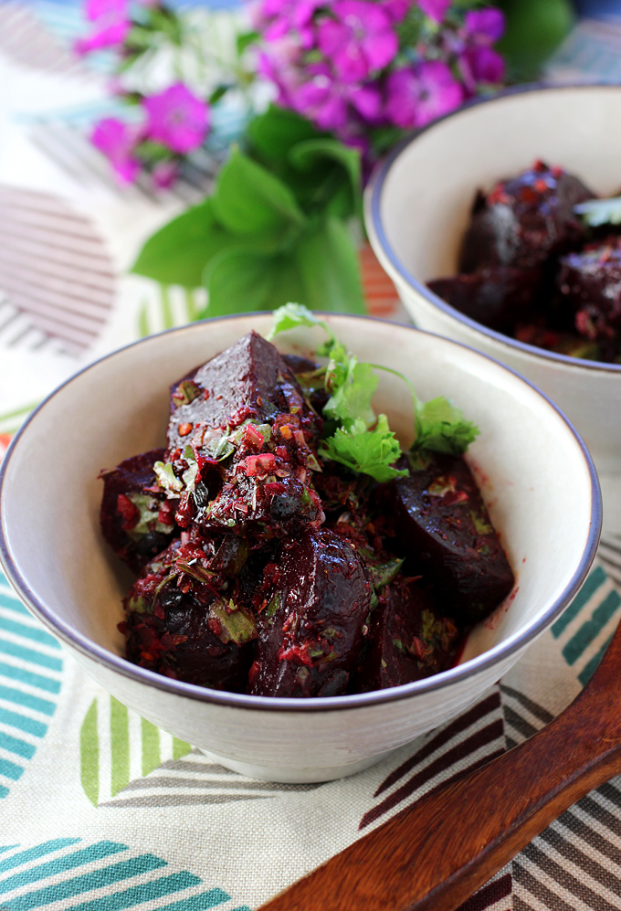 “Roasted Beets with Chili Crisp, Cilantro, and Lime” is sweet, spicy, earthy, acidic and full of umami, and sure to make even an avowed beet hater change their tune.