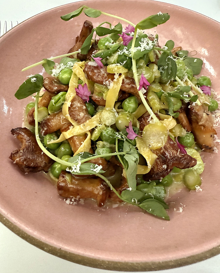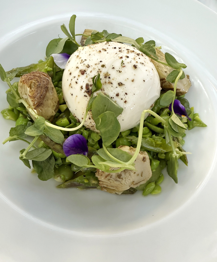 Burrata ($24) was adorned with the best of spring — English peas, fava beans, and asparagus, adding a lush touch to the gently cooked and seasoned veggies.