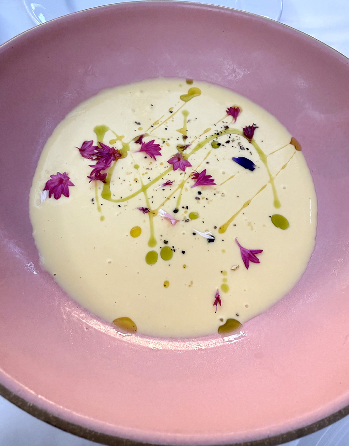 Corn soup was a special that day, and worth getting anytime it’s available. Served chilled, it has the color of butter and the texture of velvet. Dotted prettily with tiny blossoms, it had the intense taste of sweet summer corn even if we’re a week away from the official start of that season.