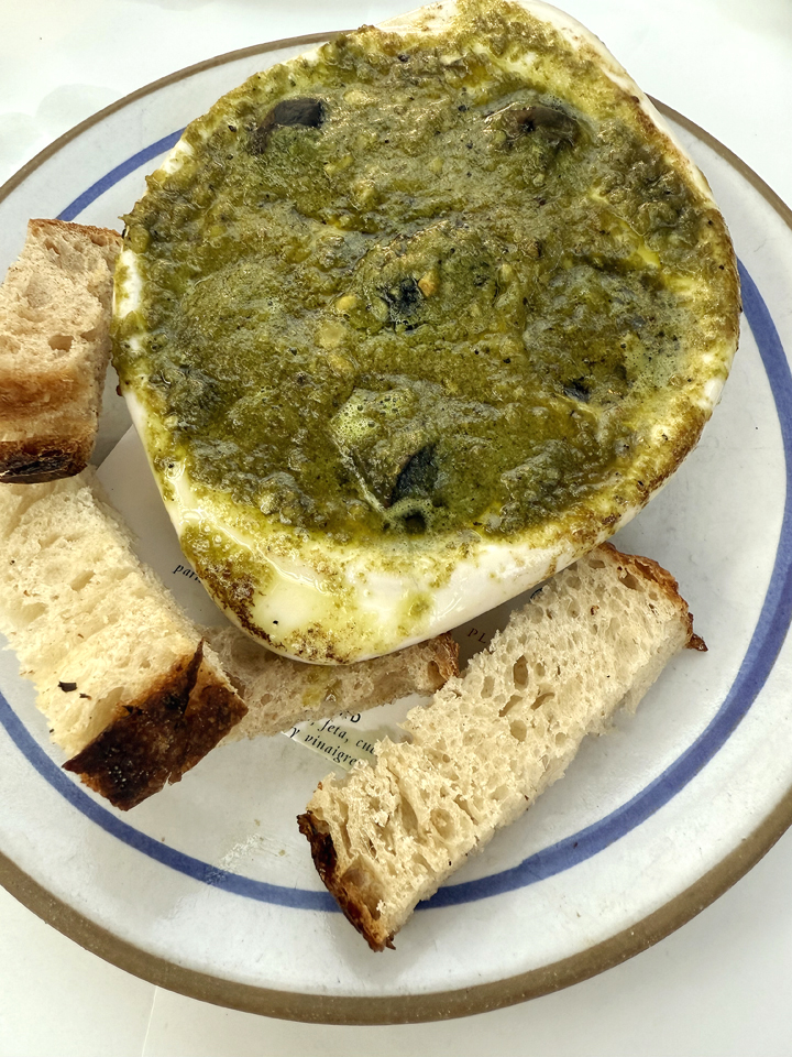 Escargot ($21) arrived bubbling hot in a cast-iron pan. What I especially liked about this version is that the garlic butter sauce was loaded with parsley, giving it a lot more body.