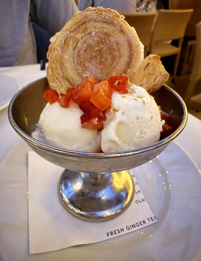 More ice cream arrived — this time in the flavor of creme fraiche that tasted like cheesecake. It was garnished with strawberries and a crispy spiral of sugared puff pastry.