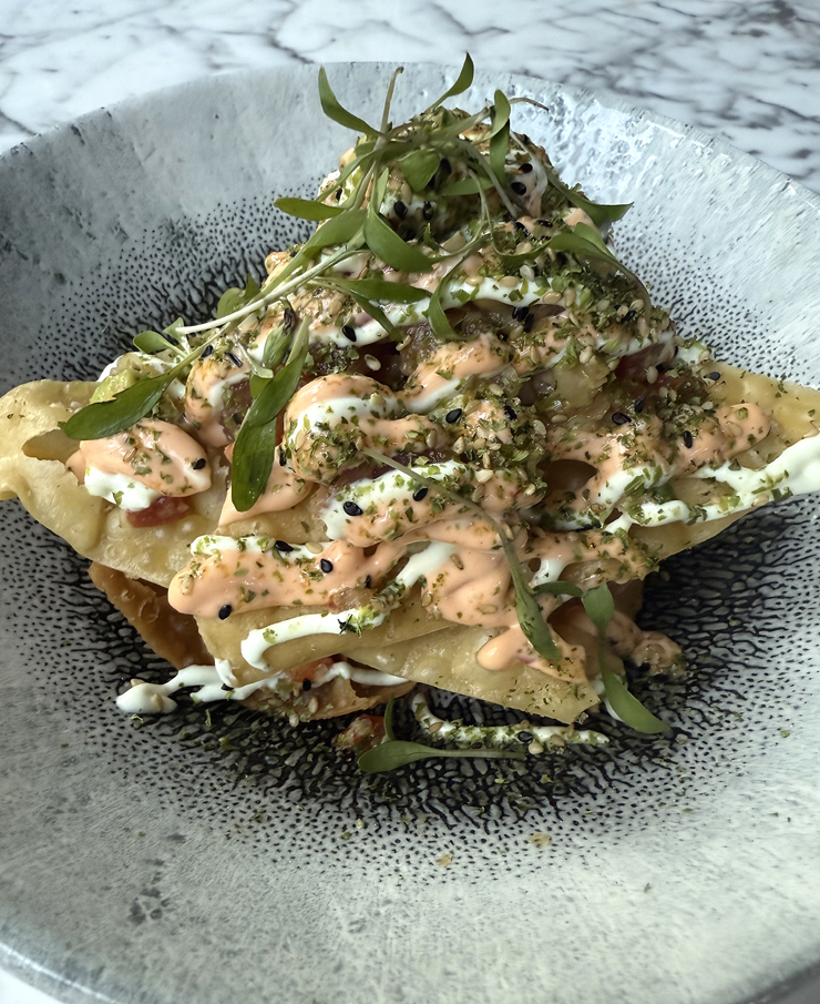 The ahi tuna poke nachos ($24) are fashioned from crispy won ton wrapper triangles that get crowned with cubes of ahi dressed with a spicy soy sauce marinade. There is diced avocado, tomato, and onions, plus strips of nori, along with squiggles of spicy sriracha aioli and wasabi cream. It makes for messy but satisfying eating.