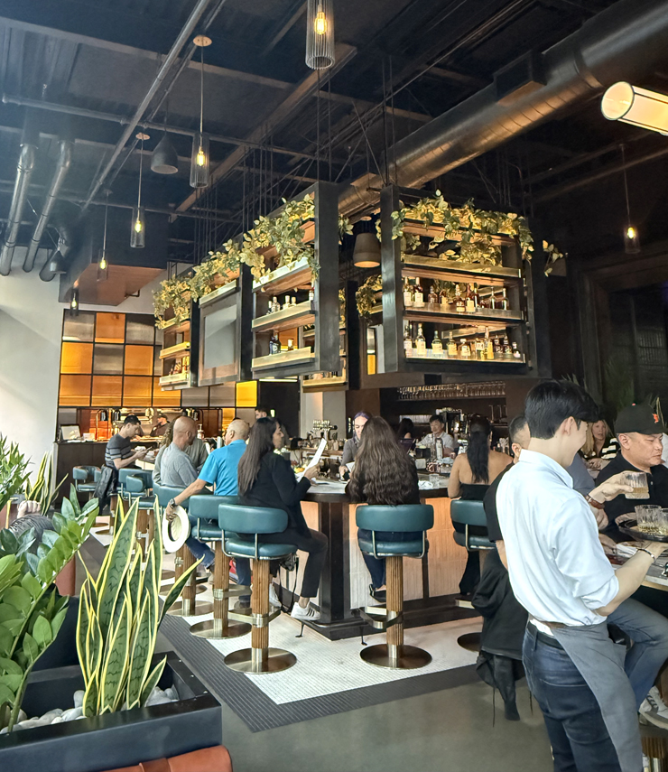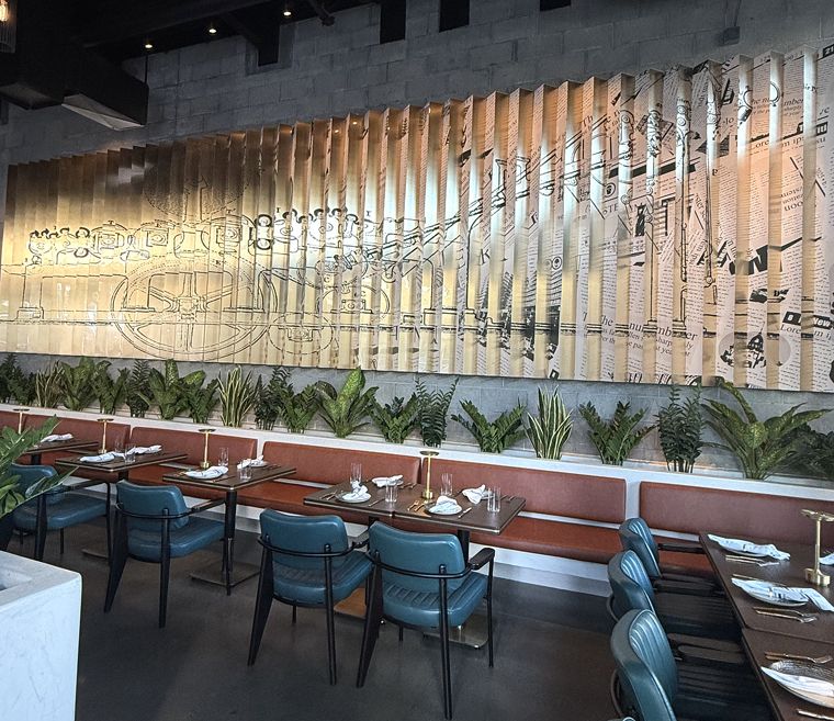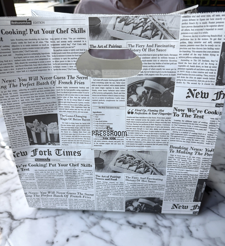 That vibe continues with the decor, marble tabletops, and plateware, with much of it in tones of black, white and gray — just like a newspaper.