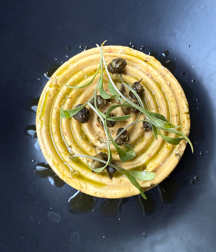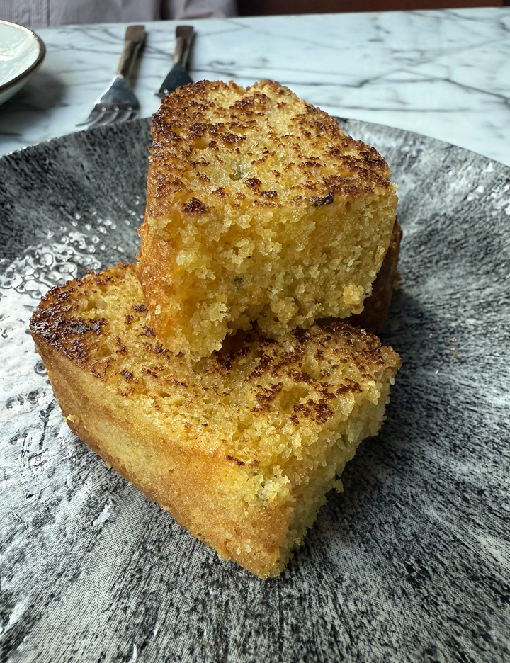 Jalapeno cornbread ($22) is sweet, spicy, and slightly crumbly, as well as enriched with bone marrow. It comes with a very artsy spiral of Calabrian-chili lime butter dotted with smoked sea salt and fried capers. It’s quite a lot of butter, perhaps more than one would ever need for three slices of cornbread.