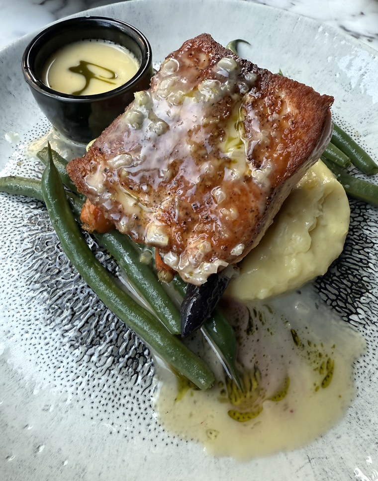 From the mains, you can’t go wrong with the pan-seared Ora King salmon ($48) that arrives perfectly medium-rare in the center and with crisp skin on top. It’s drizzled with a little lemon-beurre blanc, with more in a cup on the side should you wish for more buttery goodness to go with the buttery mash on the bottom. Green beans and carrots, cooked nicely al dente, round out the plate.