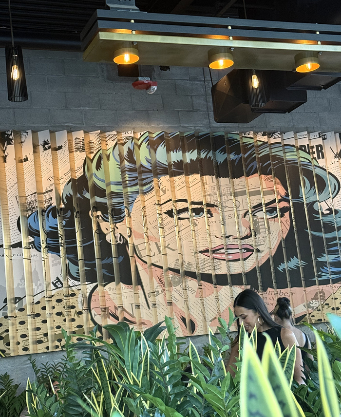 A large wall art installation has a lenticular flip effect, showing an antique printing press from one angle, and a pop-art woman’s face from another angle.