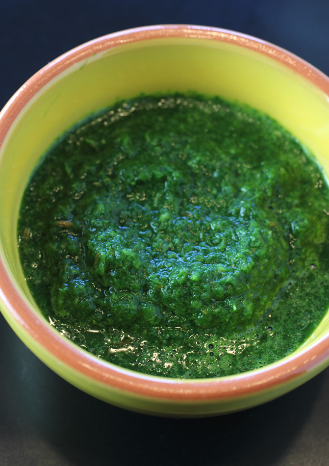 After the chicken has marinated, just grill or broil it. Serve with slices of sauteed onions, cilantro sprigs, green chilies, lemon wedges, and Pakistan’s most popular chutney. Hari chutney is a breeze to make. Just blitz cilantro, mint, serrano chili, lemon juice, garlic, vinegar, cumin seeds, and sugar with a couple of ice cubes in a blender until smooth and brilliant green.