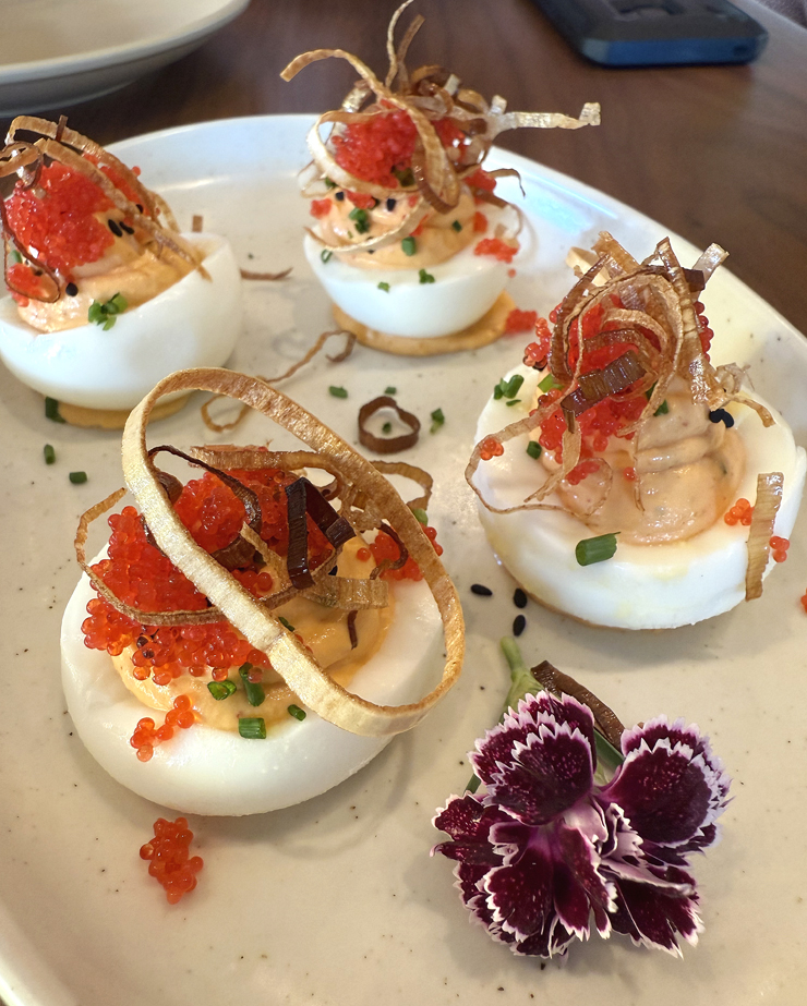 Deviled eggs ($13) go Korean with kimchi pureed into the creamy, whipped yolk filling for a hit of moderate spice and a subtle fermented tang. They get adorned with frizzled crispy leeks, tobiko, and chives for a highbrow look.