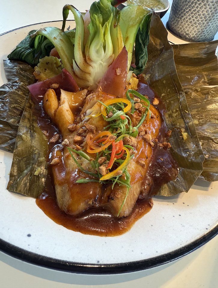 From the mains, the black cod criollo ($49) features local fish baked until silky and moist, then smothered in a miso and aji panca sauce that’s smoky, garlicky, sweet, and umami-filled. Think a more savory version of hoisin sauce. It’s served with bok choy and instead of sticky rice, a tamal that’s made from steamed quinoa. It’s not as heavy as masa, but more fluffy and creamy instead.