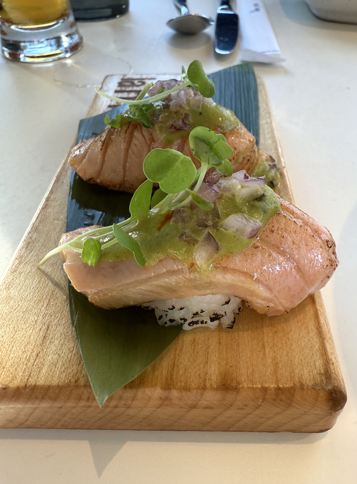 Peruvian-style salmon belly nigiri.