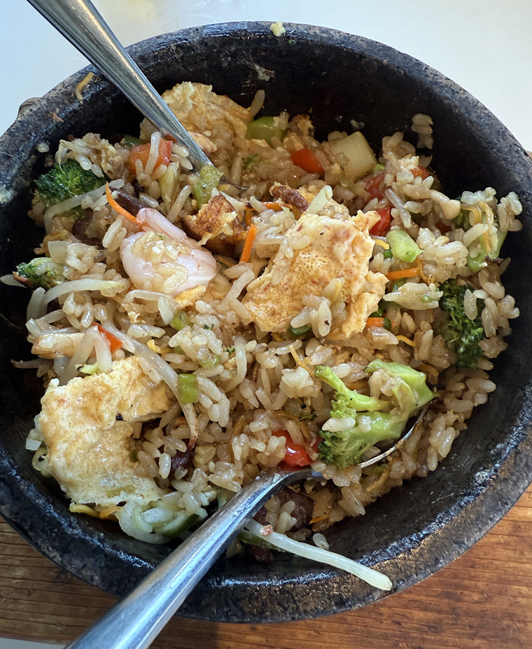 Peruvian fried rice with shrimp omelet.