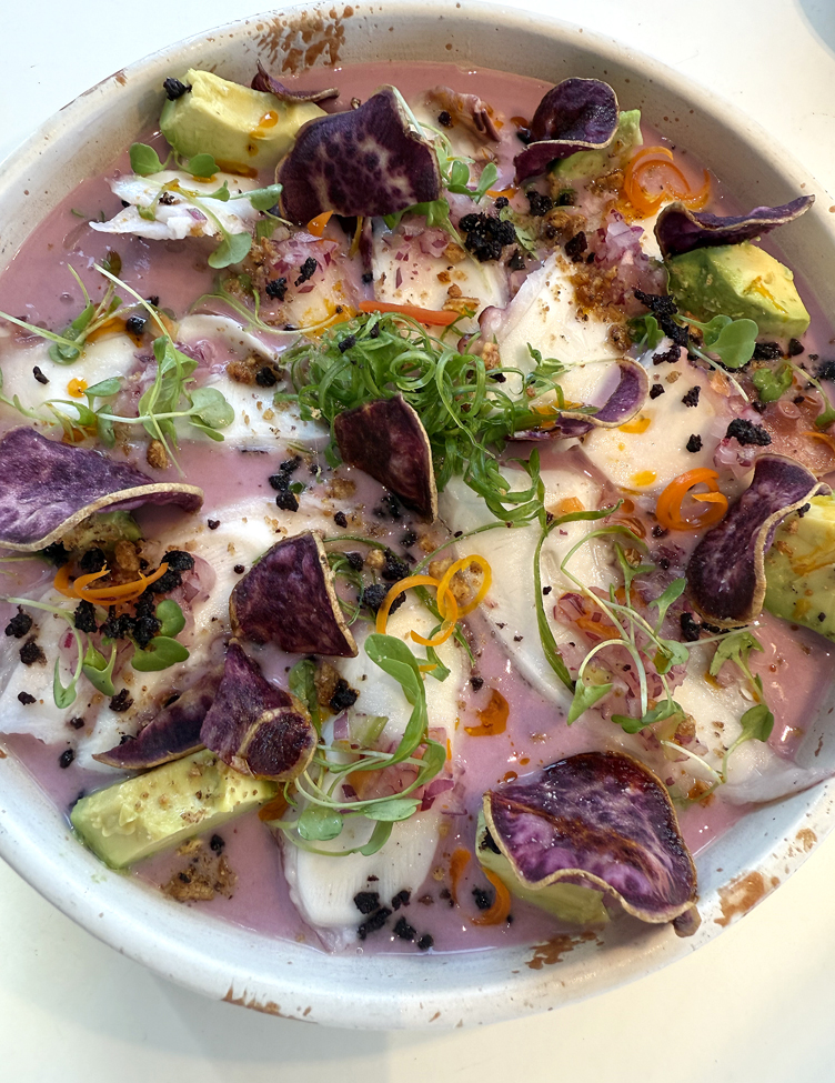 This sampler includes the Clasico, which spotlights the catch of the day — in this case, halibut — with habanero, sweet potatoes, and the traditional leche de tigre sauce of lime juice, onion, chili, and fish blitzed to create a slightly milky texture.