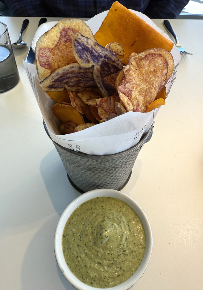 A colorful array of orange, purple and white crisp sweet potato chips, made from Peruvian tubers, is set down at each table with spicy, creamy cilantro aioli. Like the best chips and dip, this was impossible to resist.
