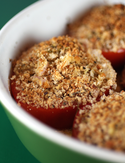 Spoon the seasoned crumbs over the tomatoes, then place back into the oven until the topping is browned and crispy.