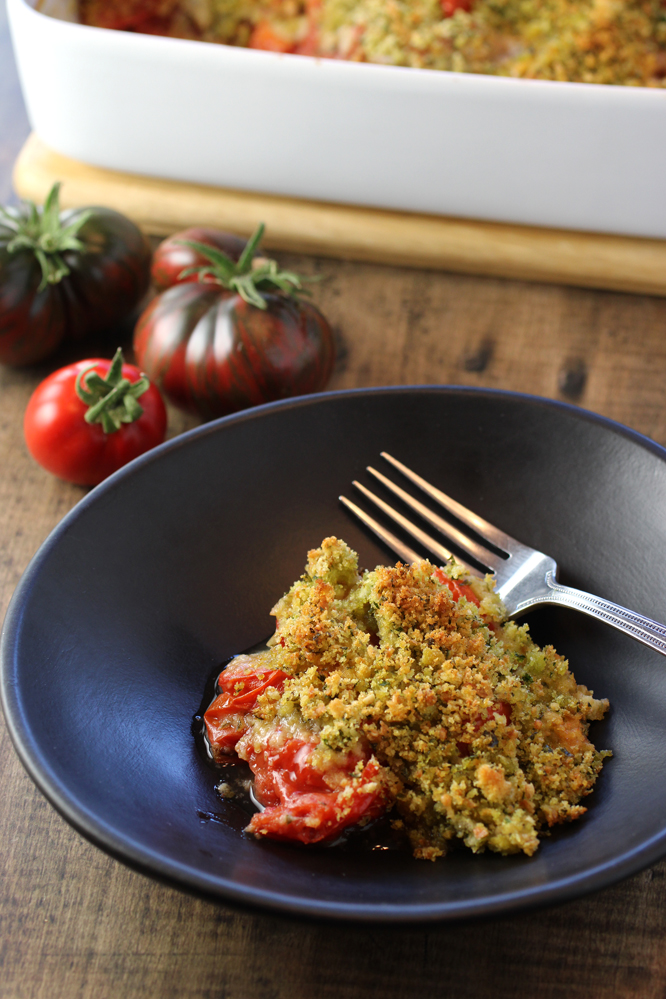 Laura eschews all of that, and simply slices the tomatoes into wedges, arranges them in a baking dish and showers the bread crumbs all over. It’s a streamlined version that I’m honestly apt to make more often.