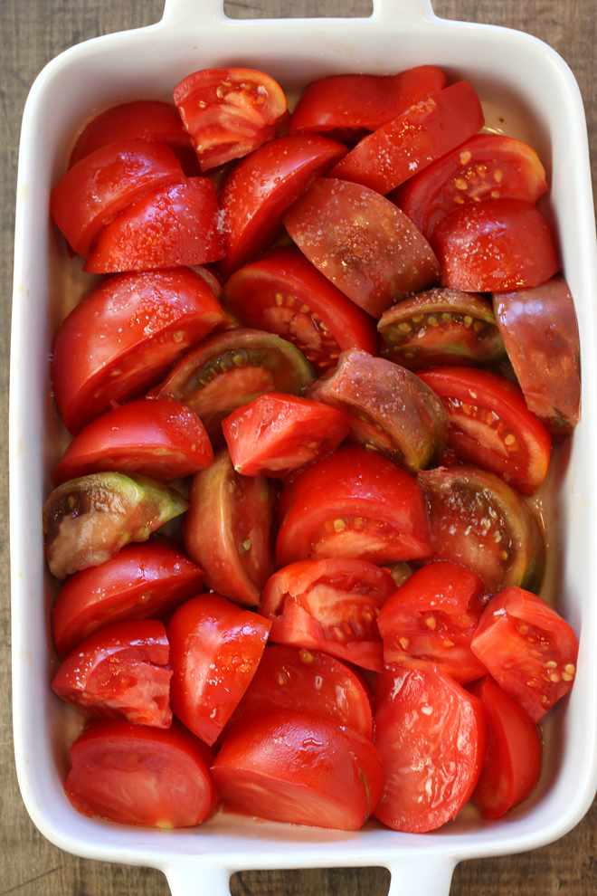 In a small casserole dish just big enough to hold the tomatoes snugly in a single layer, drizzle 2 tablespoons of the oil over the tomatoes and season with salt. Bake for 10 minutes while you make the topping.