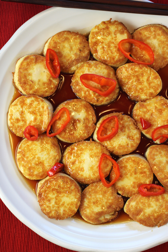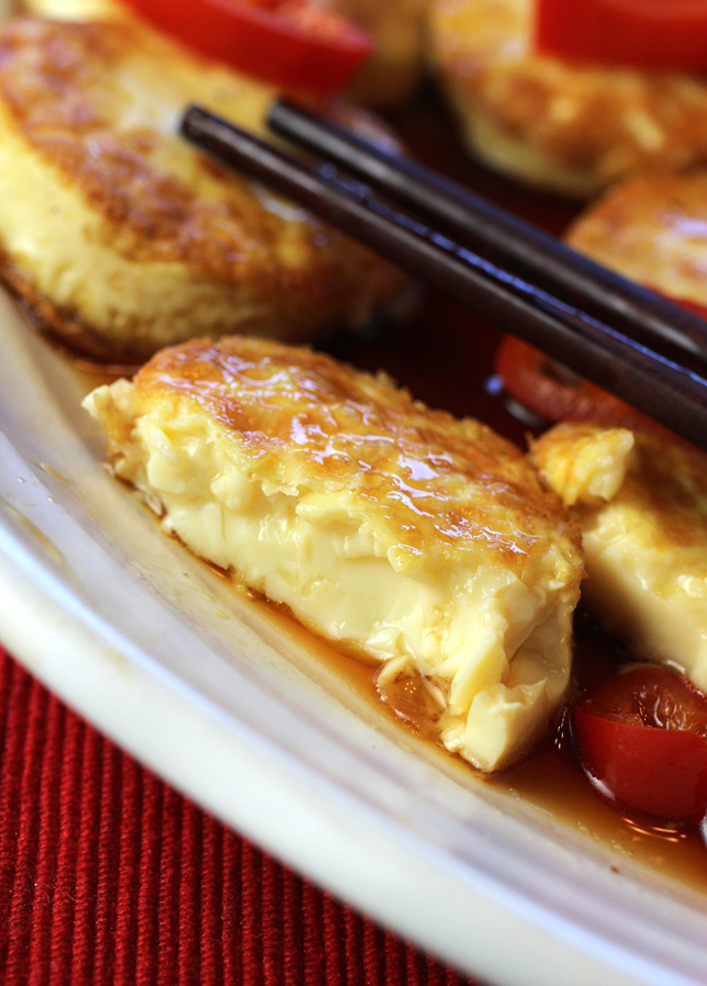 Once you have the egg tofu, it’s only a matter of slicing it into thick coins, then pan-frying in olive oil on each side until they are golden and crispy.
