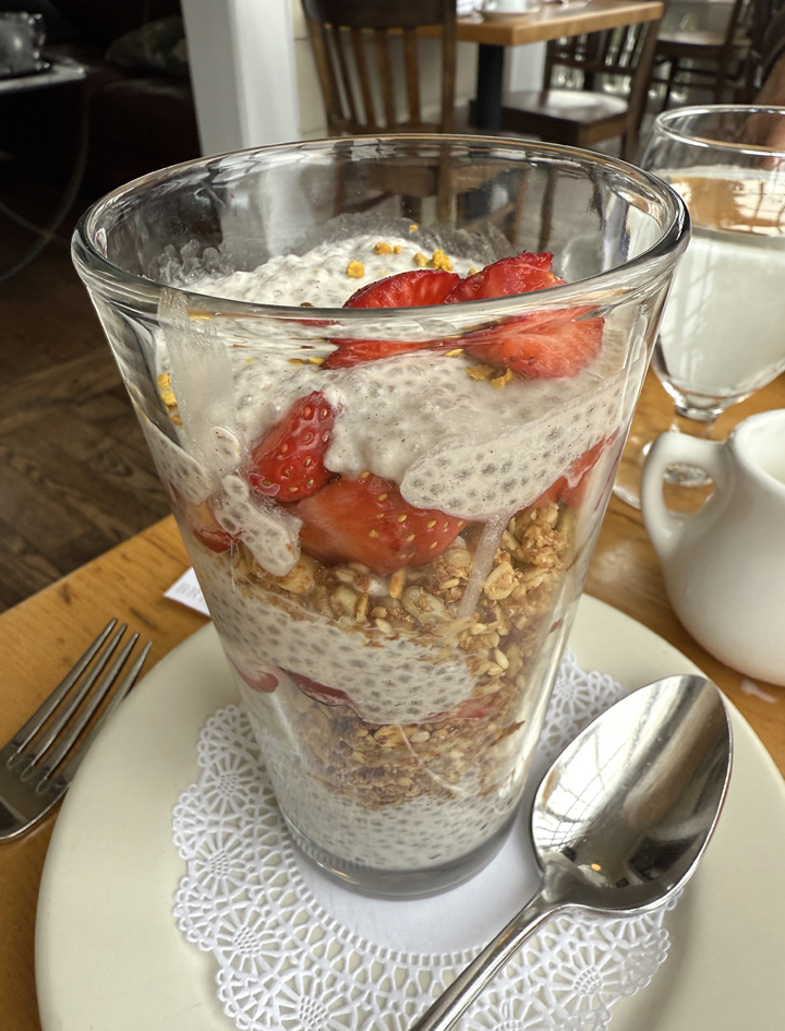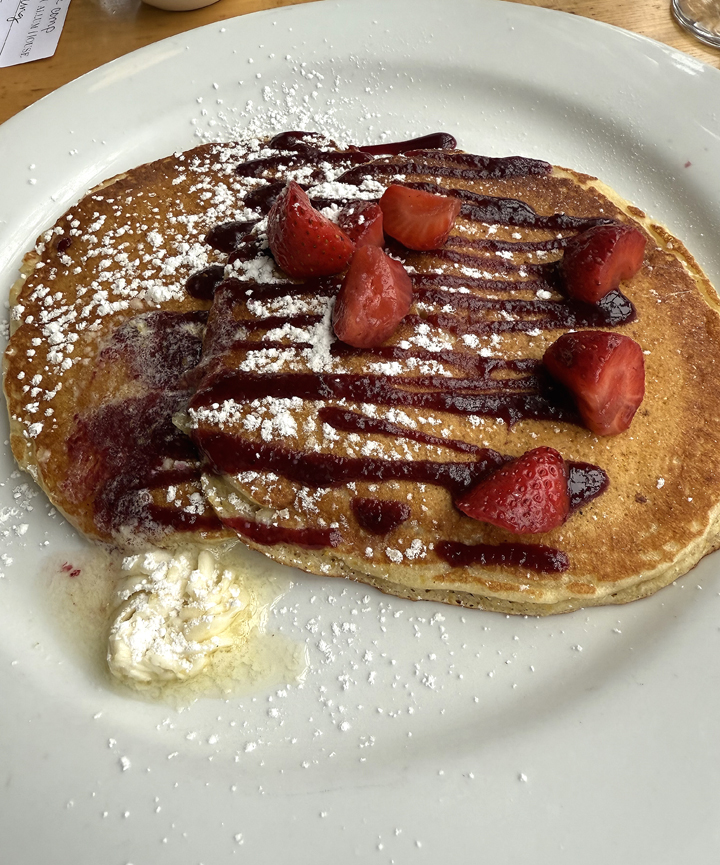 Cornmeal pancakes ($16) are light and fluffy, and finished with blackberry syrup and lemon zest butter. If you really want to indulge, add a scoop of ice cream for an additional $6. Or take a more healthful route with the coconut chia granola parfait ($15) layered with strawberries, and a toasted oat granola studded with cashews, pecans, almonds, pumpkin seeds, sunflower seeds, and sesame seeds.