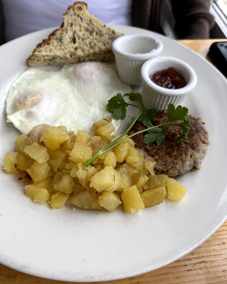 The breakfast menu is small but solid. Two eggs any style (my husband chose over-easy) comes with a pile of griddled, diced Yukon Gold potatoes, bacon or house-made pork sausage (a coarsely ground, flavorful patty), and house-made toast and jam.