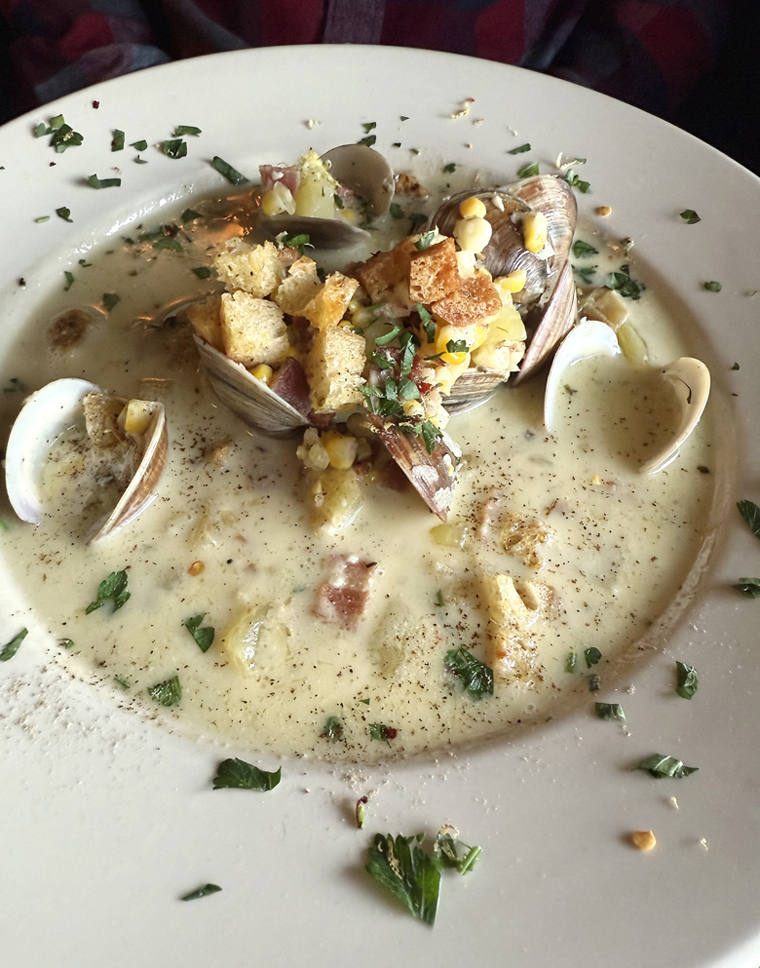 My husband started with one of dishes the restaurant is most known for, and rightly so. The steamed clam and corn chowder ($19) is an impressive bowl of clams in the shell (11 of them), sweet corn kernels, smoky Hills Ranch bacon, and chunks of creamy Yukon Gold potatoes. Thankfully, this was not an overly thick, pasty chowder, but a more brothy one in which you could taste a hint of sherry.