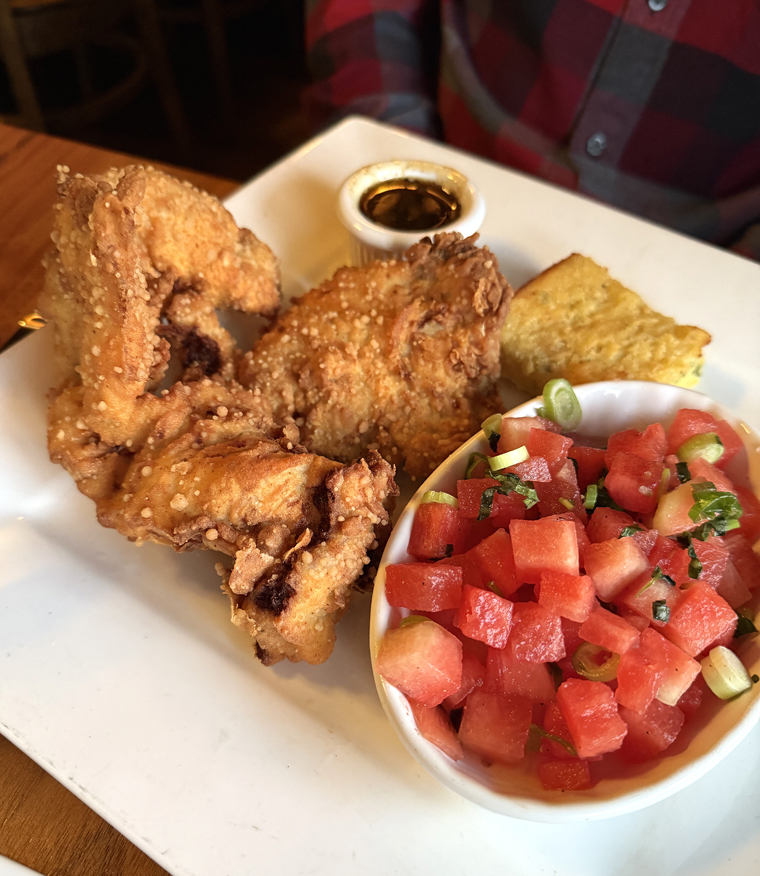 For entrees, there’s a Mary’s free-range fried chicken ($28) plate that arrives crisp and hot right out of the fryer. A bowl of diced watermelon salad is a refreshing accompaniment. The star is the jalapeno cornbread that’s so moist with a hint of sweetness and a pop of grassy heat.