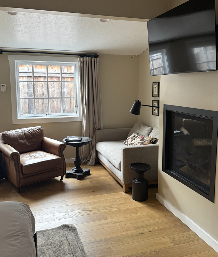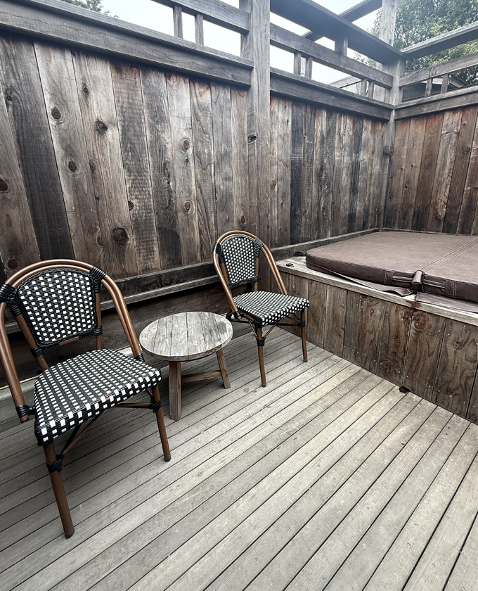 Unlock the gate to your area, and you’ll find your own private hot tub. Unlock the door, and you’ll find your comfortable room complete with a small sitting area and electric fireplace.