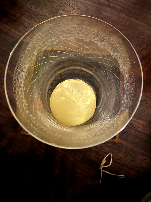 The vodka-based “XXX” is tangy with passion fruit and whey, and gets a hint of creaminess from vanilla. It comes garnished with a tiny spoon holding Champagne pearls.