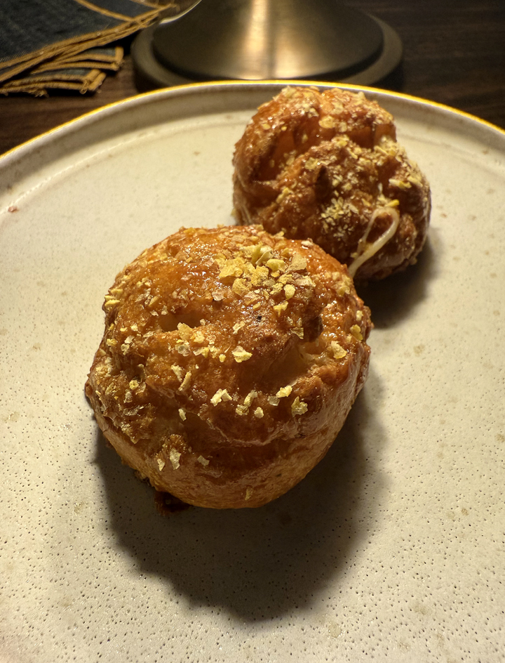 Korean corn-cheese puffs ($8) arrive hot and crisp with the sweetness of corn, heat from pickled jalapeno, and the cheese pull of smoked mozzarella. It’s as if you fried a tiny cream puff that was filled with the flavors of Korean street food inside.