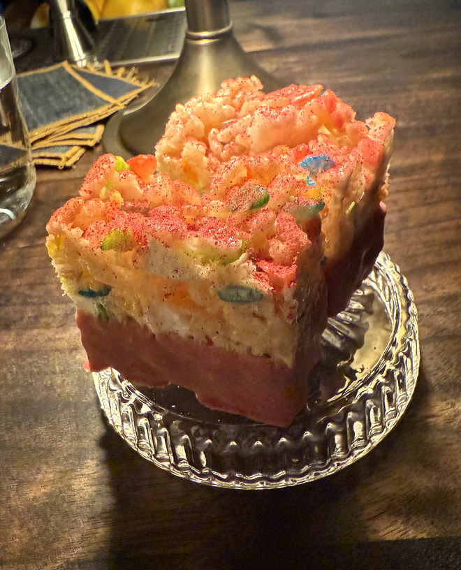 Of the two desserts offered, we went with the Rice Krispie treats ($8 for two pieces) made with yuzu and raspberry, with their bottoms dipped into fruity white chocolate. The taste is like your two childhood favorite cereals rolled into one bite: Rice Krispies and Fruity Pebbles.