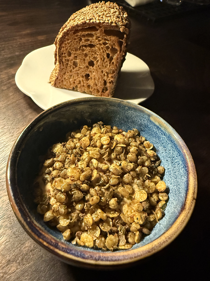 The kitchen sent out the burdock and carrot dip ($12), knowing that a lot of people might not readily order it, thinking it too hippy-dippy. It is far from that. It has the velvety texture of chicken liver mousse — while being vegetarian. It’s earthy and savory, and gets a hint of heat from togarashi, along with crunch from fried sprouted lentils over the top. It’s served with thick slices of sesame-crusted bread with a moist, chewy crumb.