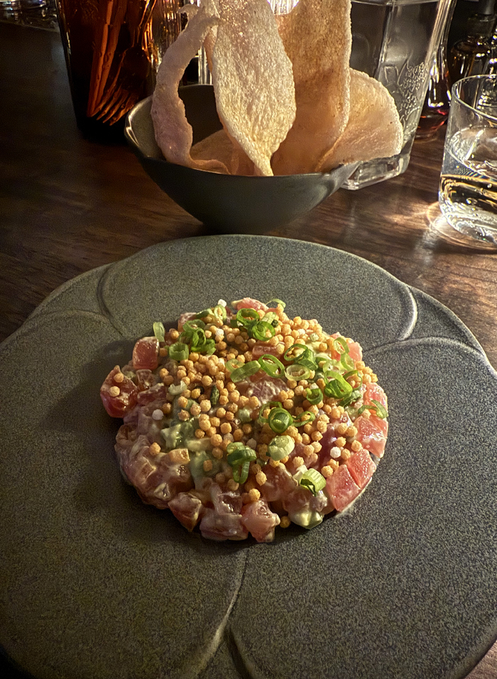 Tuna tartare, with its precise dice of ahi, avocado and curls of scallions, is beautiful to behold. It tastes even better with its seasoning of plum miso, accentuating its natural umami. The chips are light and airy, kind of like the more sophisticated cousin of prawn chips. They taste of sweet onions, making you wonder why all onion chips can’t taste like this.