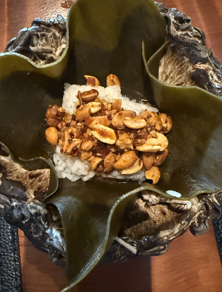 To accompany this, a server pounds a peanut XO sauce with five spice in a mortar and pestle, then spoons it over koshihikari rice, giving it an incredible toasty taste. Slip some of the rice into the remaining broth, and enjoy a spoonful of pure comfort.