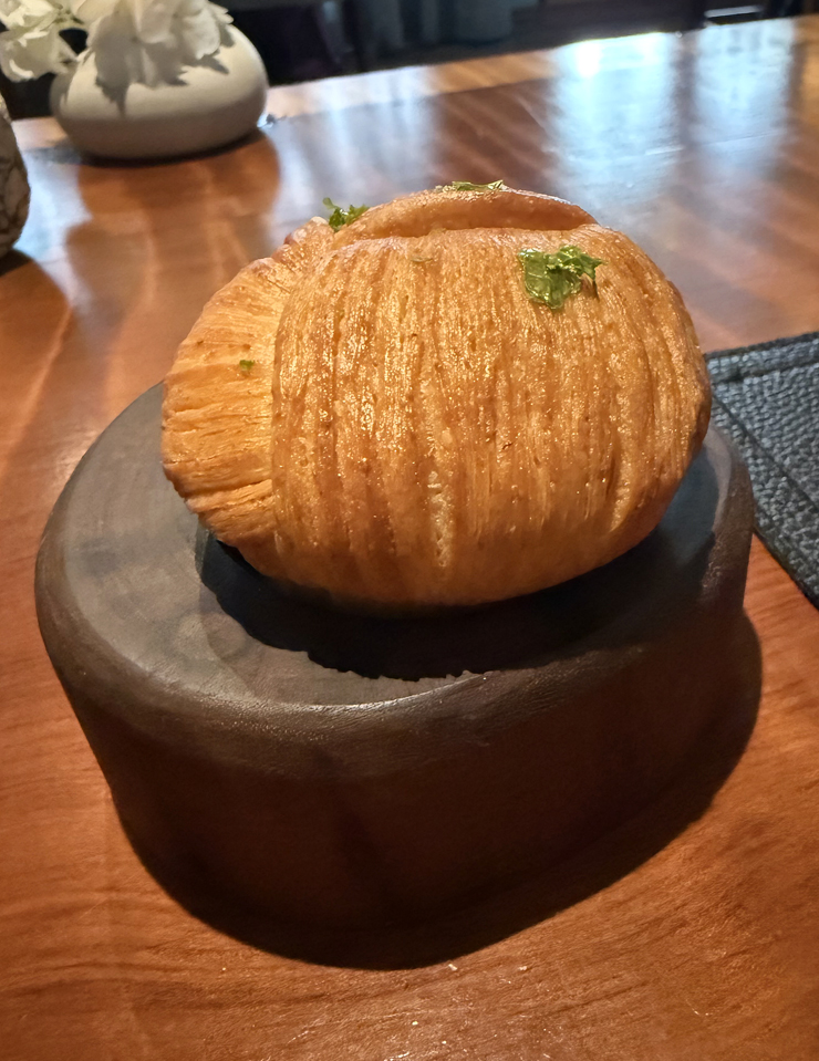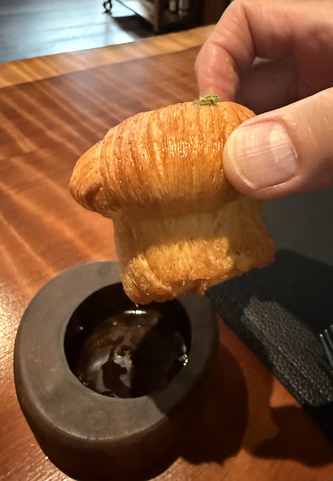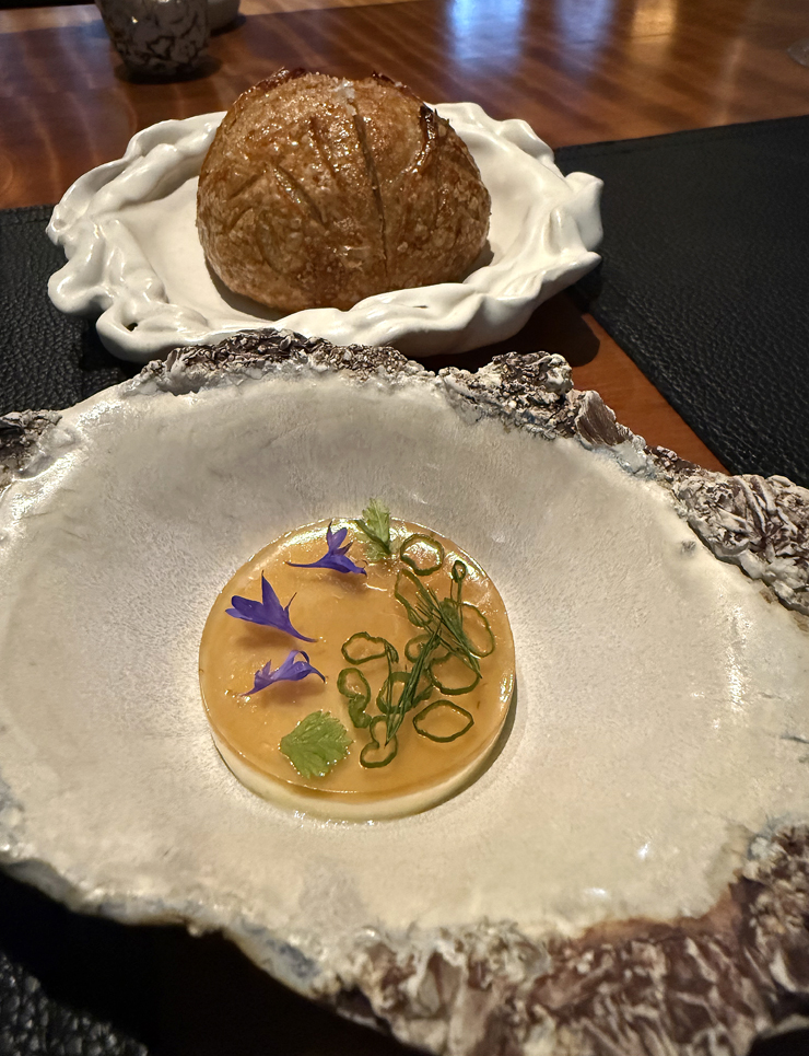 Hot and glossy sourdough bread is served with this course with butter topped with a layer of beef bone broth gelee. Spread it on the bread to add a savory, beefy taste to the lush butter.