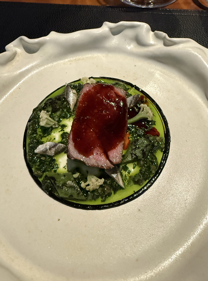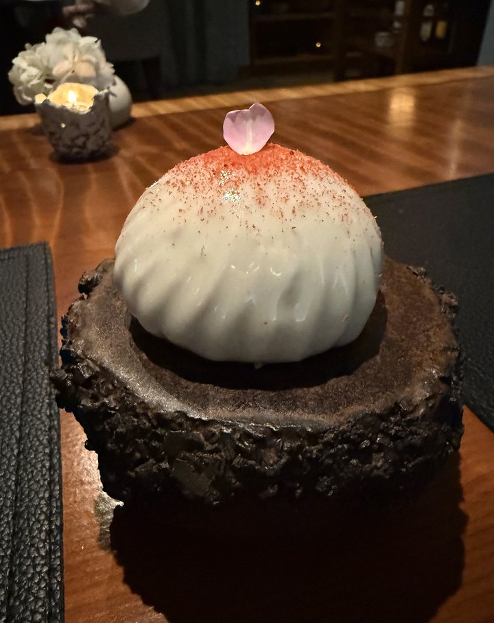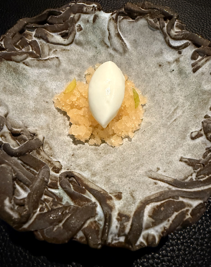 The final savory course is dry-aged ribeye, aged 32 days, deepening its notes of minerality and iron. It gets plated artfully in a green pool of chimichurri with a rim of black garlic and squid ink sauce. A beef jus, reduced for 48 hours, gets drizzled over the meat at the table. This may be a land dish, but it eats unexpectedly like surf & turf, with the squid ink providing a briny note that really works.