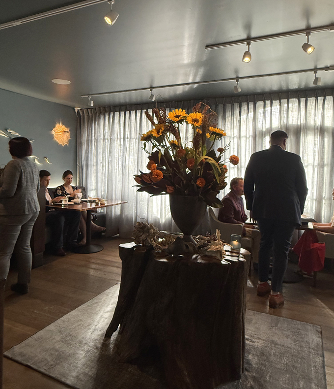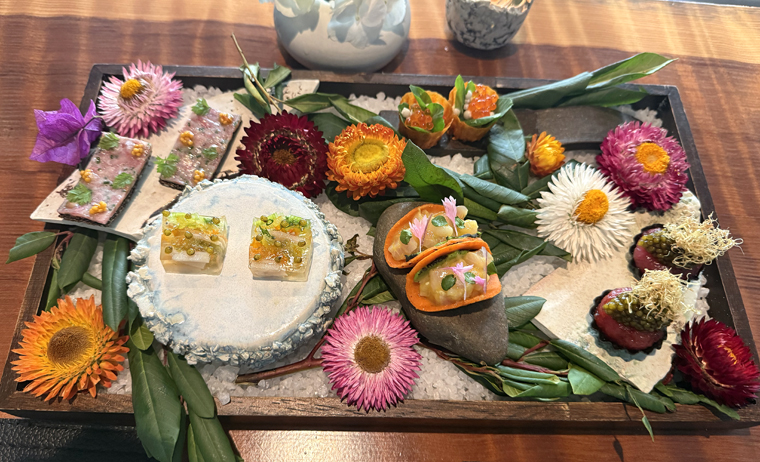 The evening opens in dramatic fashion with a large wooden board of canapes set on your table. With leaves and flowers scattered about, smooth stones, and a heavy ceramic dish the color of sea foam, it makes for a tableau that evokes a picnic on an ocean bluff.