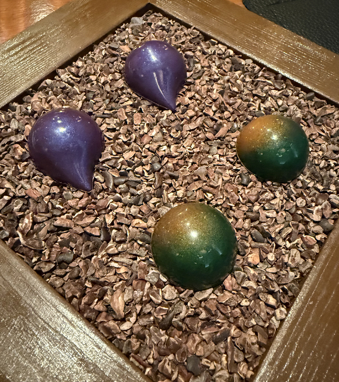 Mignardises come in the form of pretty chocolate blackberry-hazelnut and apricot-sarsaparilla bonbons. To take home, there’s a chocolate bar, made with top-notch dark chocolate and chewy dried persimmons.