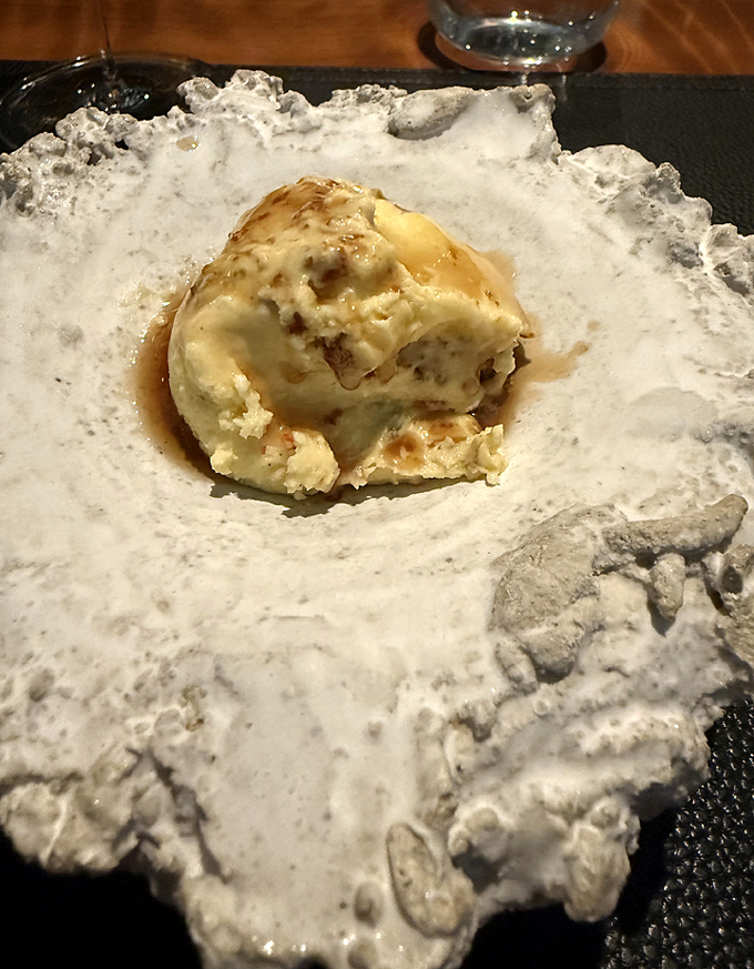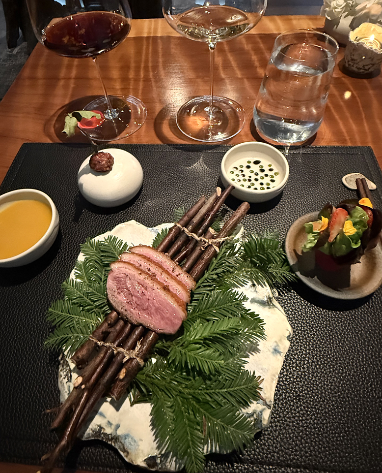 Duck gets aged for 14 days before getting smoked over cherry wood. The breast gets sliced and served beautifully atop a raft of tied branches and ferns. It’s juicy and moist, with a sweet smokiness reminiscent of ham or bacon. The leg is turned into a juicy meatball full of gingery Asian flavors. A salad bundle with strawberries and marigold is off to the side to dunk into a sweet potato vinaigrette. There’s also a small, shallow bowl of concentrated duck broth that had me dreaming of a big bowl of it for ramen noodles.